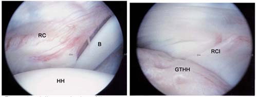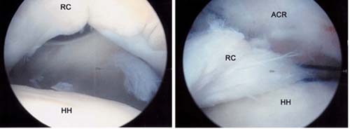 Left, Arthroscopic view of the rotator cuff from within the joint shows the rotator cuff (RC),